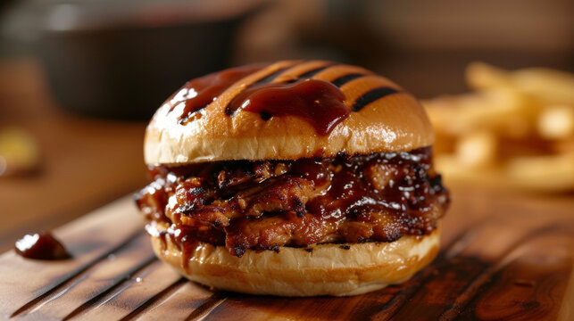 This BBQ pork sandwich is a symphony of flavors with tender and smoky pork tangy BBQ sauce and a hint of heat from jalapeno peppers. The grill marks on the bun give it a rustic