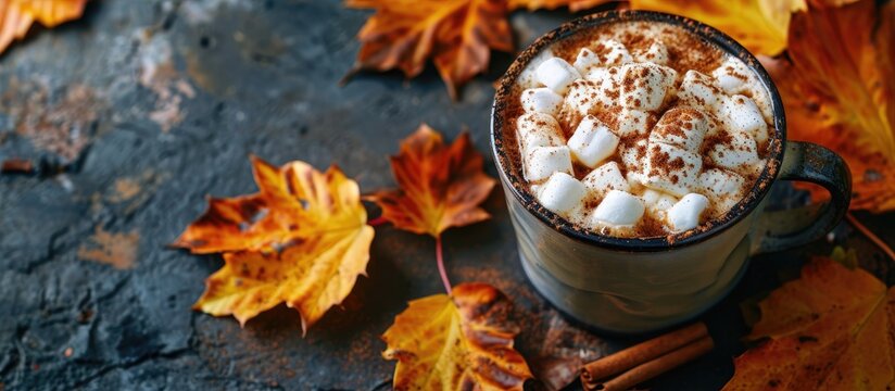 Hot cocoa drink with marshmallows and cinnamon in a mug on a wooden board with autumn leaves. Copy space image. Place for adding text or design