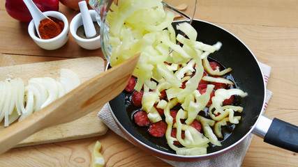 Woman adding black pepper with grinder to the cooking food in a saucepan.