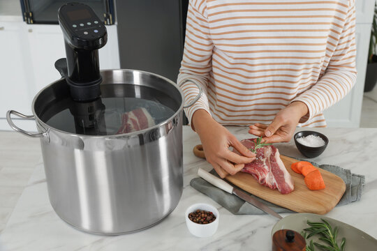 Woman adding rosemary to meat near pot with sous vide cooker at table, closeup. Thermal immersion circulator