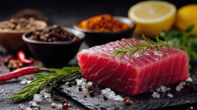 A piece of fresh tuna steak sits on a dark stone plate. Spices and herbs are arranged in small bowls around the steak. Lemon slices are also present adding to the display.