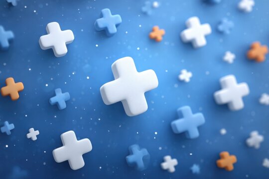 Plus Sign Explosion: 3D Render of White Plus Symbols Floating in Light Blue Space