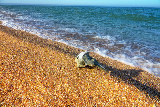 Waves washed up common porpoise (Phocoena phocoena) skull on a sandy beach. The death of dolphins in the Sea of Azov