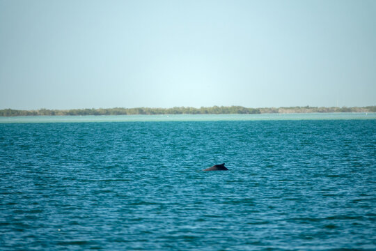Dolphins (probably bottlenose dolphins) in the Persian Gulf, near artificial islands and Abu Dhabi