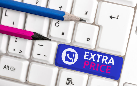 Text sign showing Extra Price. Business photo showcasing extra price definition beyond the ordinary large degree White pc keyboard with empty note paper above white background key copy space