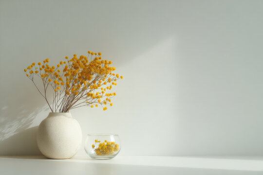 ceramic vase filled with dried flowers on clean white background casting soft shadow creates tranquil atmosphere