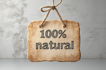 Authentic 100% natural product tag with twine, showcasing pure organic goodness and eco friendly appeal for conscious consumers seeking quality.