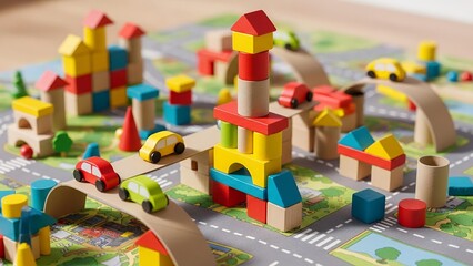 A miniature city made of colorful wooden blocks and cardboard ramps sits on a road-patterned play mat with toy cars