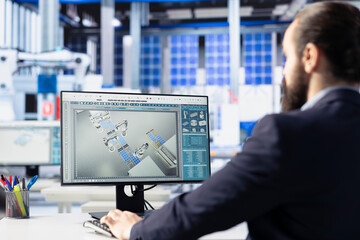 Production manager in solar technology factory reviewing system logs on computer to identify and address operational inefficiencies. Photovoltaic plant employee monitoring data on PC screen, close up
