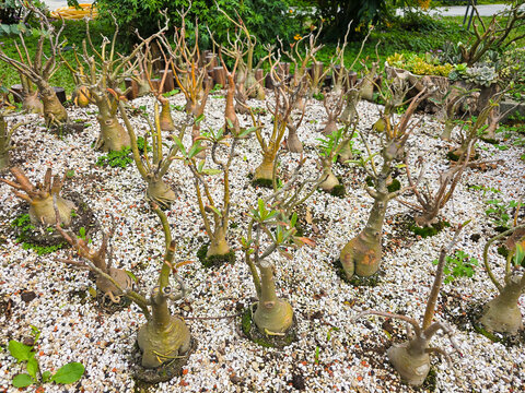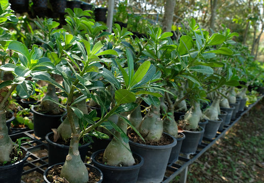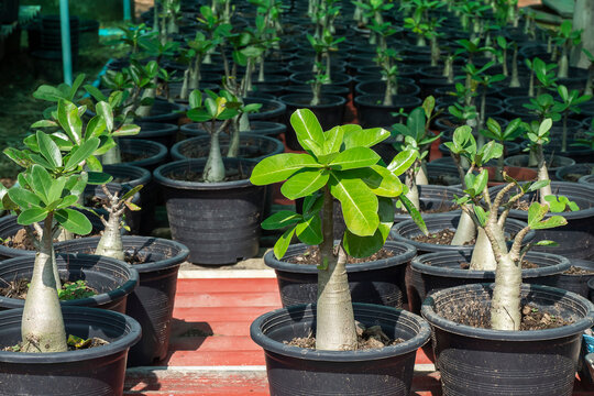Big green beautiful Adenium Obesum (desert rose or mockazalea)seedling in black plastic nursery pots for sell at the open market.