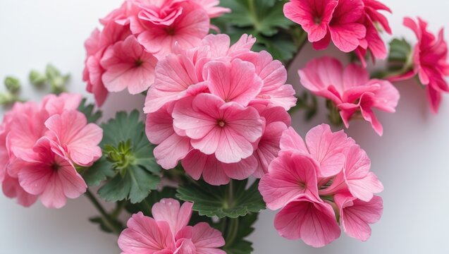 Pink geranium flower against a white background. Creative layout. Idea for summer gardens. Design aspect. Detailed close-up view.