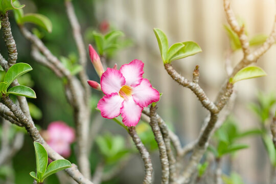 Pink white adenium flower blooming under tropical sunlight. Desert rose flower closeup in natural green background. Tropical adenium plant with soft pink white blossom