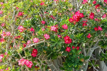 Semi succulent blooming shrub Adenium Obesum growing primarily in the desertas decorative shrubs for urban streets and public parks in Dubai,UAE.