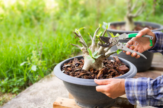 Hand farmer holding pruning shears for branch adenium obesum tree in plastic plant pot . Azalea working gardening to try to plant growth trees. organic modern agriculture concept.