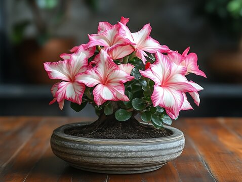 Blooming Desert Rose, Potted on Wood Surface