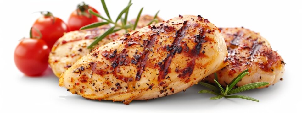 A skinless chicken breast on a white background, sits adjacent to a small sprig of green rosemary