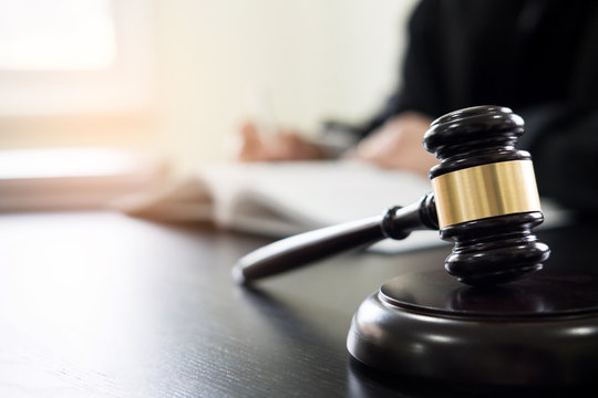 gavel and soundblock of justice law and lawyer working on wooden desk background.