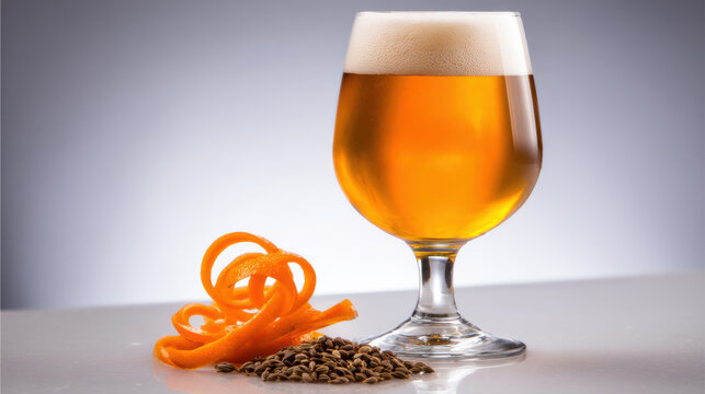 Wit bier A minimalist composition of beer ingredients including barley, hops, and adjuncts like a fresh orange peel spiral and a small pile of coriander seeds, on a light airy background.