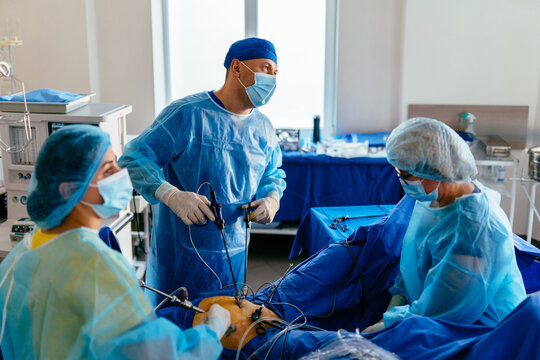 Gynecological laparoscopic surgery in progress with surgeon adjusting instruments at operating table