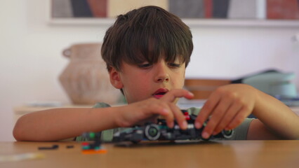 Boy examines underside of toy race car while adjusting block pieces, focused on structure and small mechanical details at table indoors