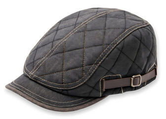 Quilted dark gray flat cap with diamond stitching and adjustable leather strap on isolated background isolated on transparent background