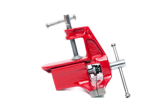Industrial metal press with a dark patina.  Heavy-duty machine with adjustable clamping mechanism.  Complex  components show precision engineering