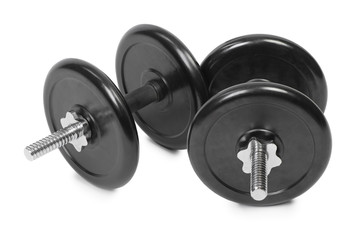 Top view of an adjustable metal dumbbell with a set of extra plates on white background.