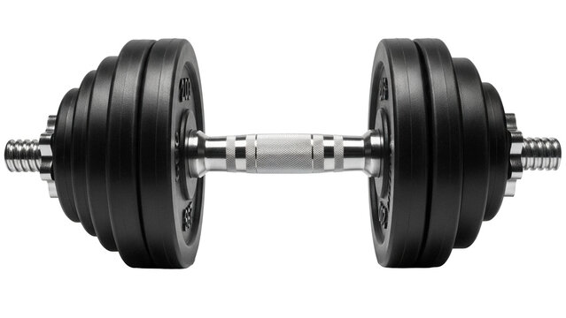 Shiny black dumbbell with adjustable weight plates for fitness training. Isolated on transparent