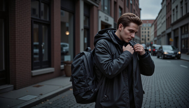 Techwear enthusiast adjusting backpack straps in foggy urban alley, modern survival fashion