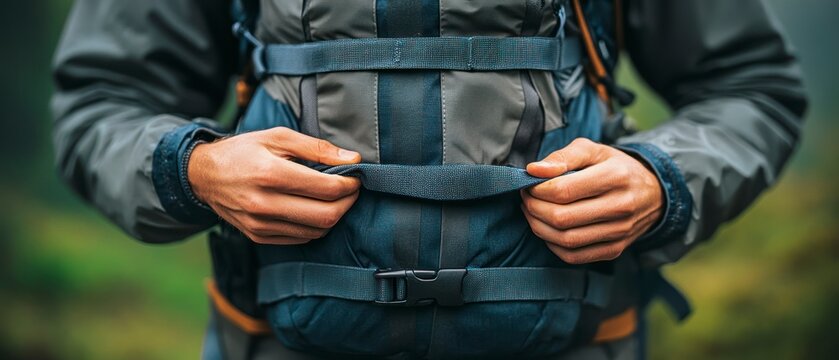 Adult male is strapping and adjusting his nylon backpack straps outdoors, demonstrating the functionality of hiking gear.