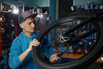 Bearded repairman repairing mountain bicycle on bike rack working in bicycle repair shop with dark interior. Male mechanic performing diagnostics and repairs of bicycle. Concept of maintenance of bike