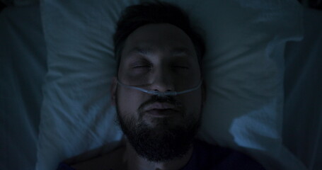 Man waking up in hospital bed with a headache, adjusting to the post-operative discomfort .