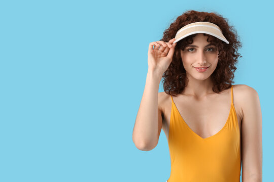 Young smiling woman adjusting visor cap on blue background