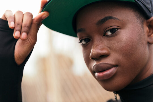 close up portrait of a young tender african american woman in casual wear adjusting her cap against a blurred background