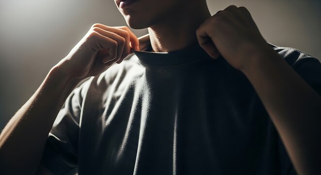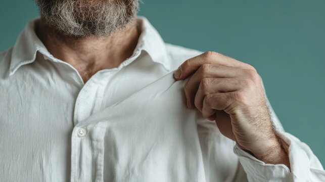 A close-up image featuring a man adjusting the collar of his white shirt, embodying a casual yet sophisticated style, suitable for many personal and professional occasions.