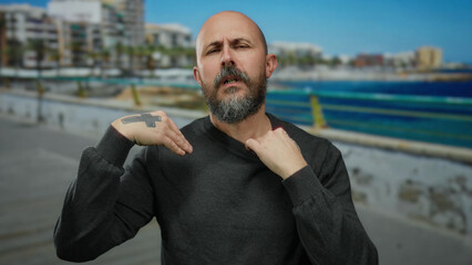 Man with a beard and tattoo adjusting his collar on a sunny seaside promenade with blurred buildings in the background.