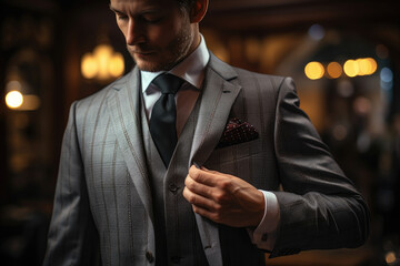 Person's hand adjusting the collar of a classic tailored suit. Generative Ai.