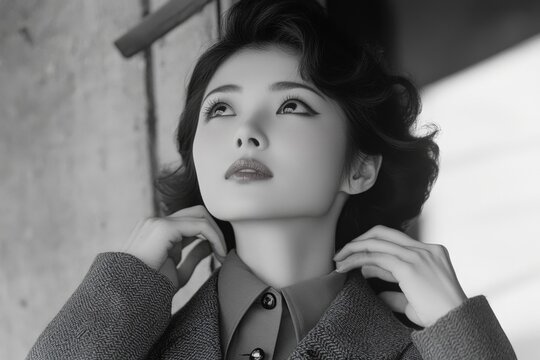 A Japanese woman adjusting the collar of her coat with both hands, her posture radiating confidence and ease.