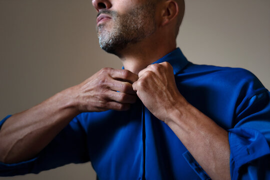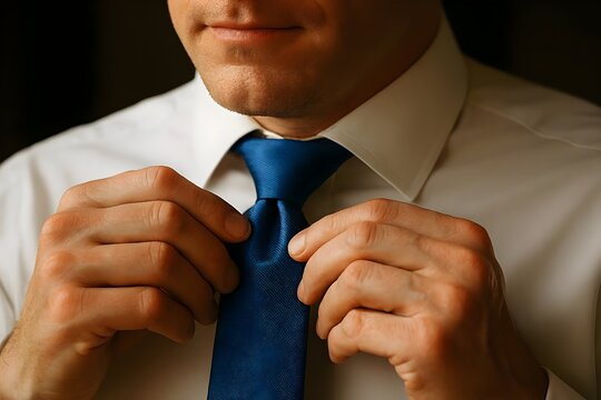 Man adjusting blue tie in white shirt for business meeting or formal event professional attire concept