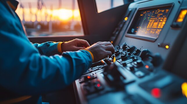 Wind turbine engineer adjusting controls on a turbine nacelle, warm, soft light from a setting sun, detailed view of the controls and the engineer careful adjustments, focus on operational