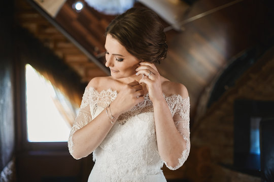 Bride looks into a mirror while adjusting her earring, wearing a lace gown and veil. A quiet, intimate moment of preparation before the ceremony.