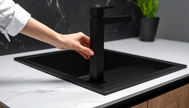 Plumber adjusting a faucet in a modern bathroom. Precision and function