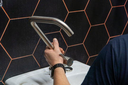 Plumber changes broken, leaking plumbing fixtures in the kitchen. Repair of a water tap. Plumber uses a wrench to install the faucet in the bathroom. An adult man changes the faucet in the kitchen.