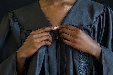 Friends preparing for graduation, adjusting cap and gown in bedroom