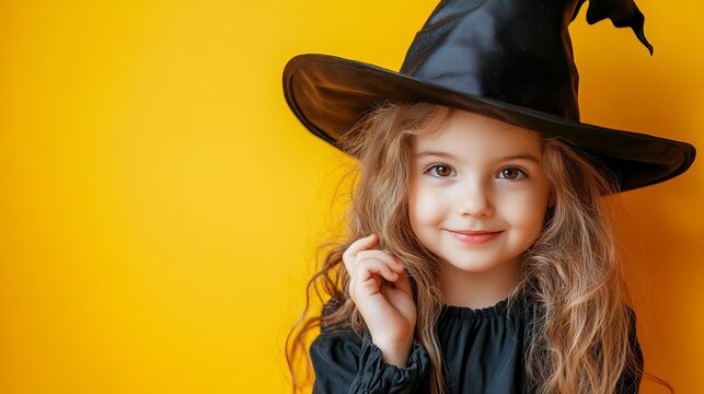 A little cute girl in a witch costume adjusting her magic hat Halloween theme with a yellow background
