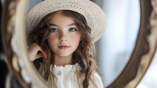 fashionista adjusting a stylish hat while looking into a mirror, capturing a candid moment