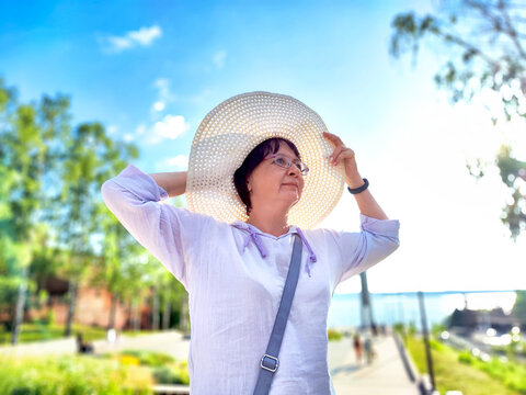 A woman is playfully adjusting her large sun hat while standing in a vibrant park filled with trees under a clear blue sky