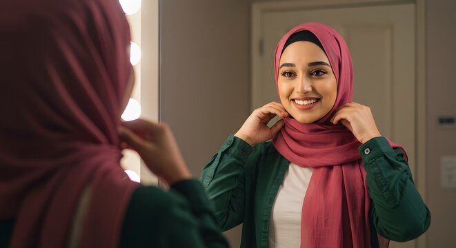 lifestyle portrait of elegant and happy middle aged Asian Indonesian Muslim woman in traditional hijab adjusting the Islamic scarf in front of the mirror