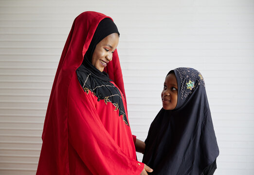 A young Asian Muslim woman adjusting the hijab worn by her daughter