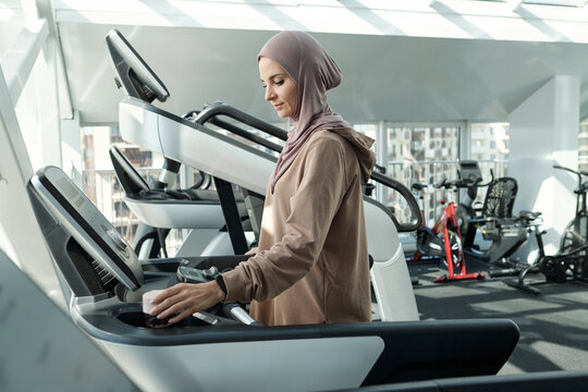 Side view medium shot of young adult Muslim woman wearing headwrap starting exercise in gym standing on treadmill adjusting settings before running